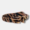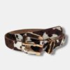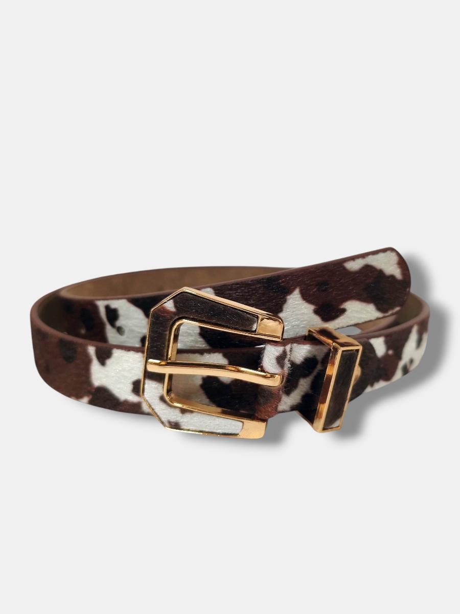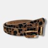 Cinturón en ante sintético con estampado en animal print, con tamaño ideal para presillas y hebilla metálica forrada.