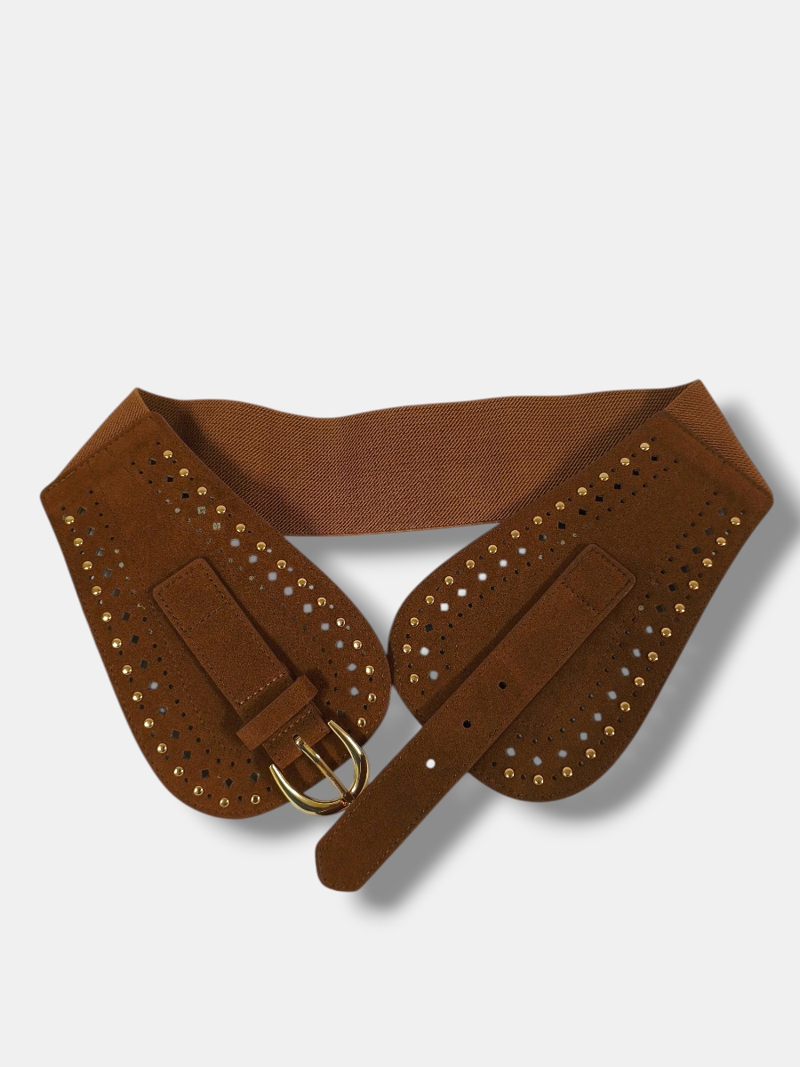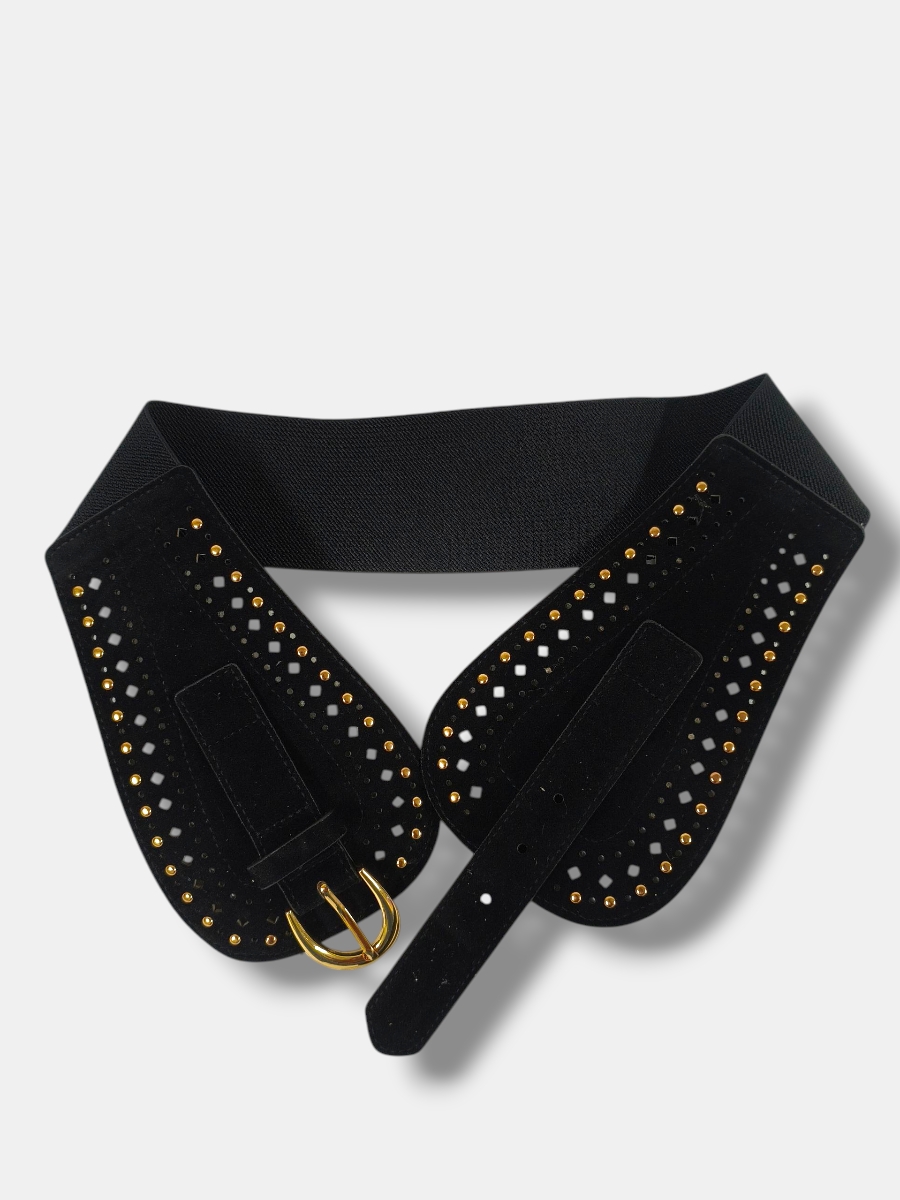 Cinturón elástico combinado en ante sintético con enganche tirilla y doble tira minitachuelas.