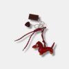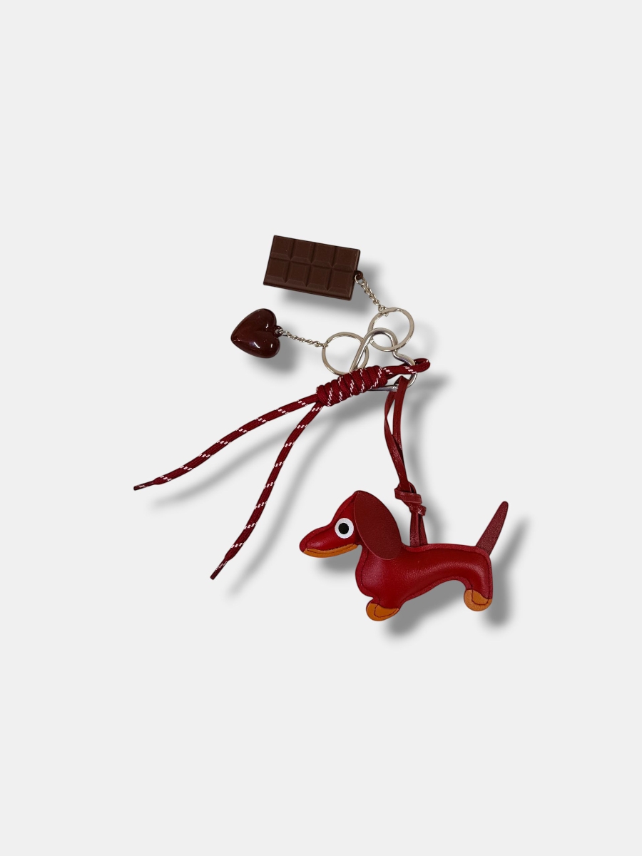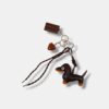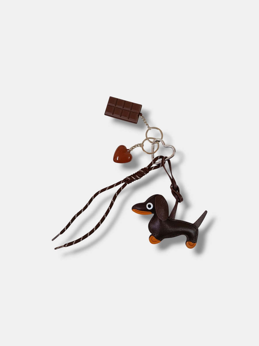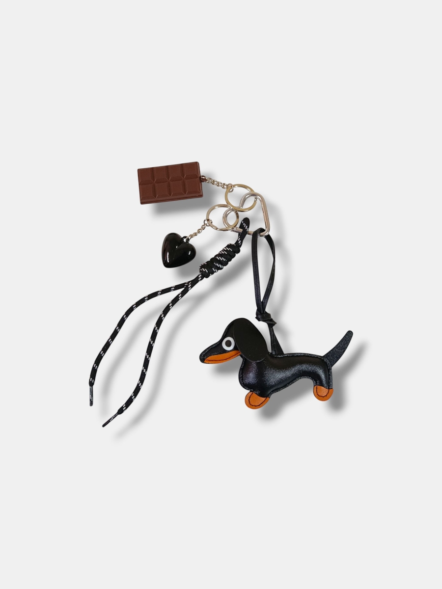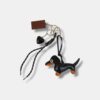 Llavero efecto piel teckel, con varios accesorios y nudos de cordón combinado.