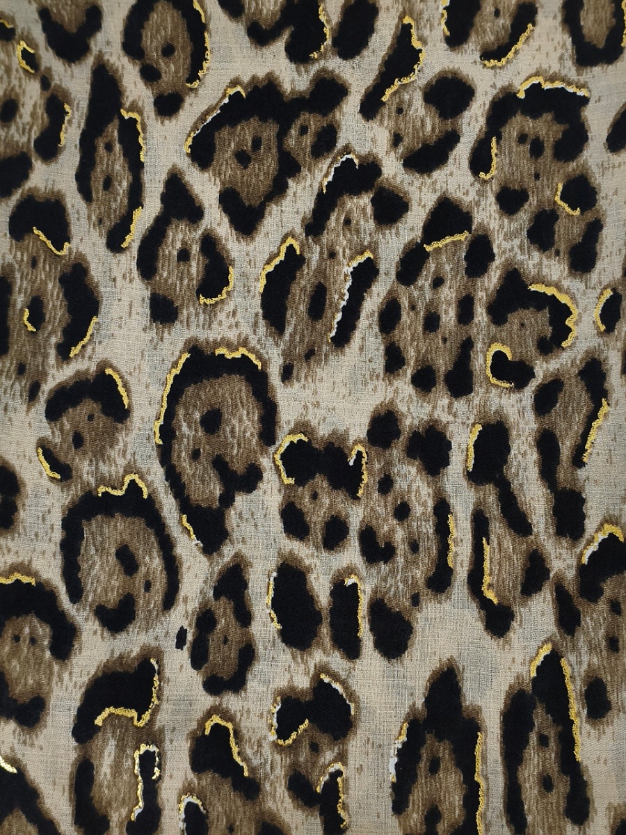 Pañuelo viscosa animal print con toques dorados sin flecos.