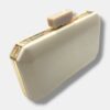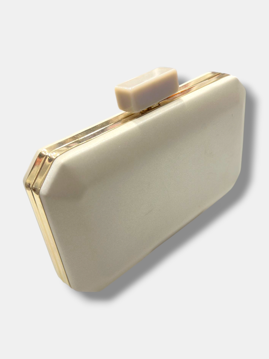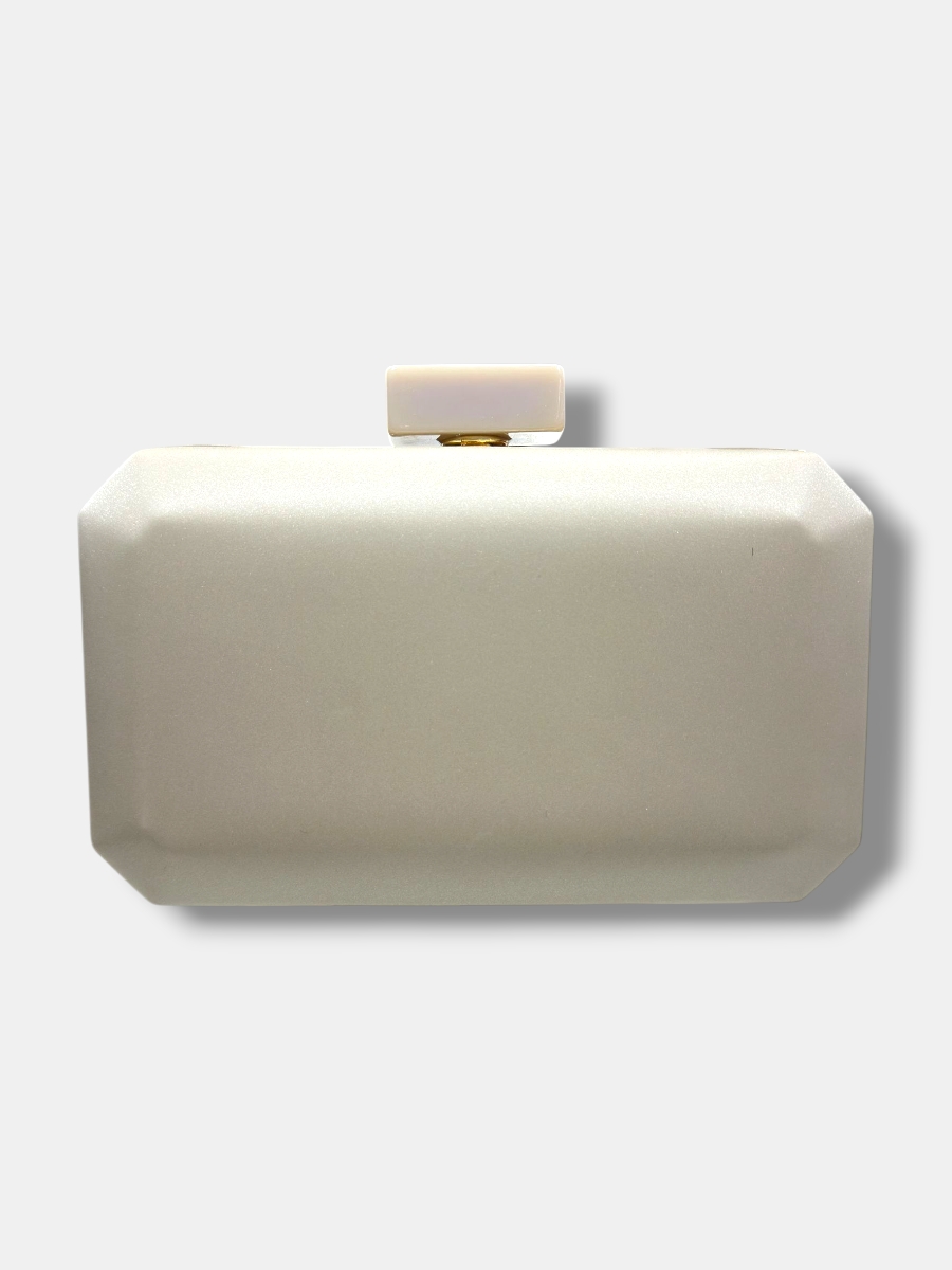 Clutch de fiesta confeccionado en tejido acrílico mate con borde metálico y esquinas con forma, cierre rectangular combinado y asa de cadena de eslabones. Ideal para eventos especiales.