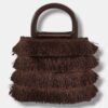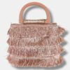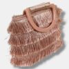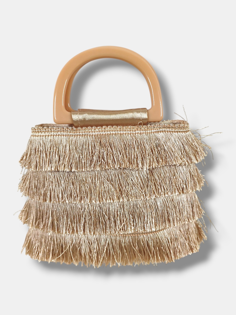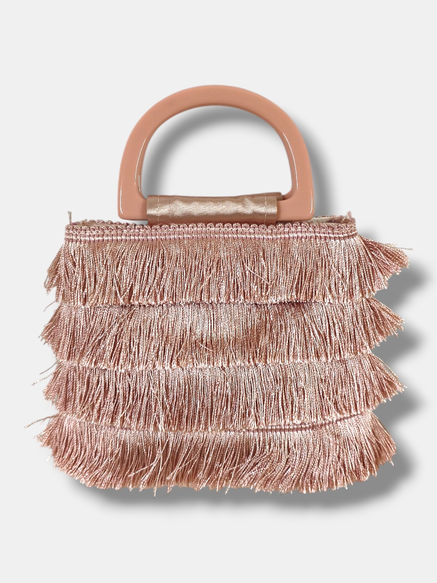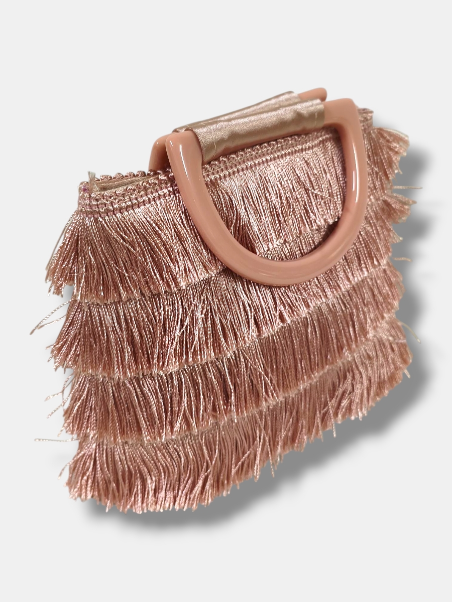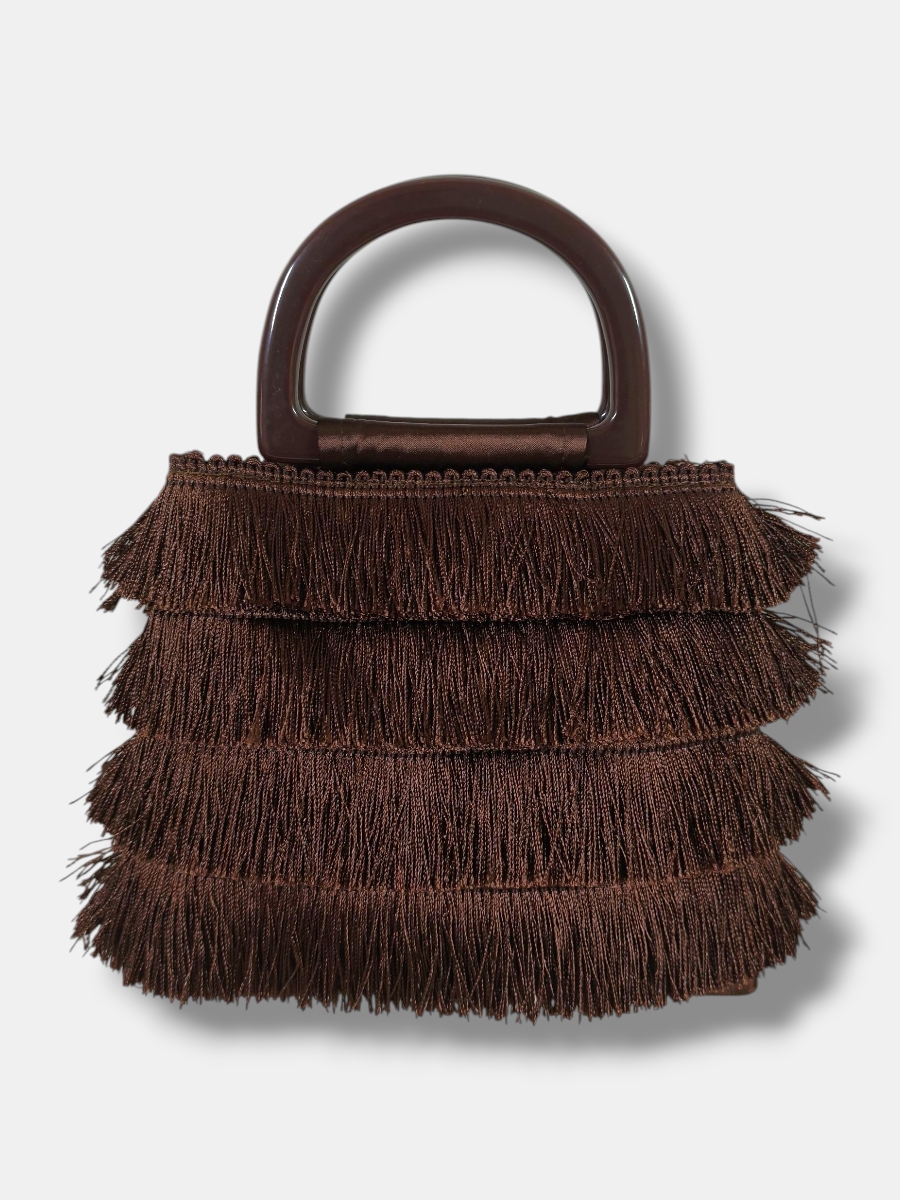 Bolso de fiesta con cuatro volantes de flecos, asa de metacrilato colorido y cierre de cremallera. Incluye asa de eslabones metálicos para llevar cómodamente al hombro. Un accesorio moderno y con estilo para destacar en cualquier evento.