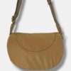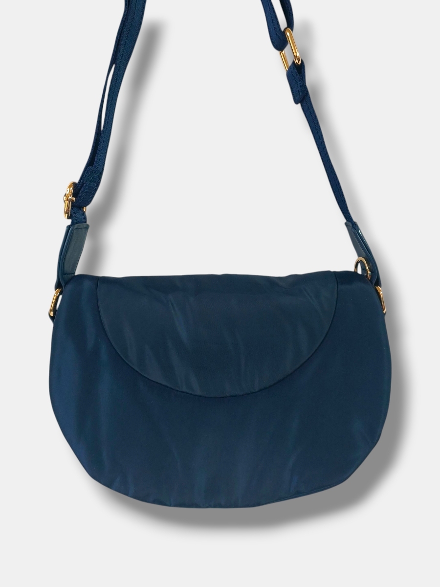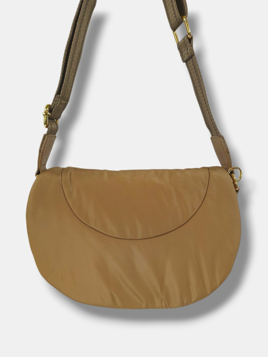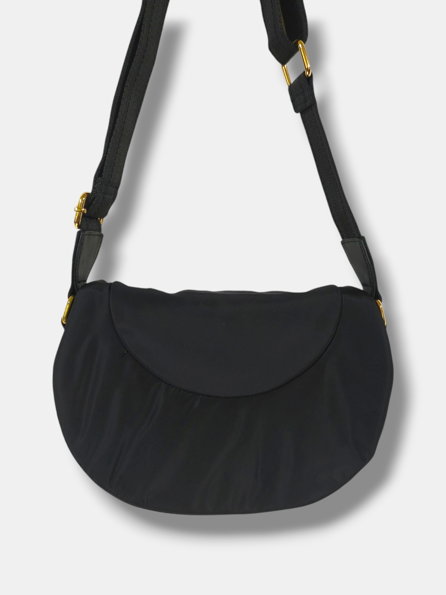 Bolso de nylon en forma de media luna con tapeta completa y asa de loneta regulable. Práctico y moderno, ideal para el uso diario con un toque de estilo.