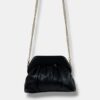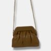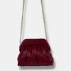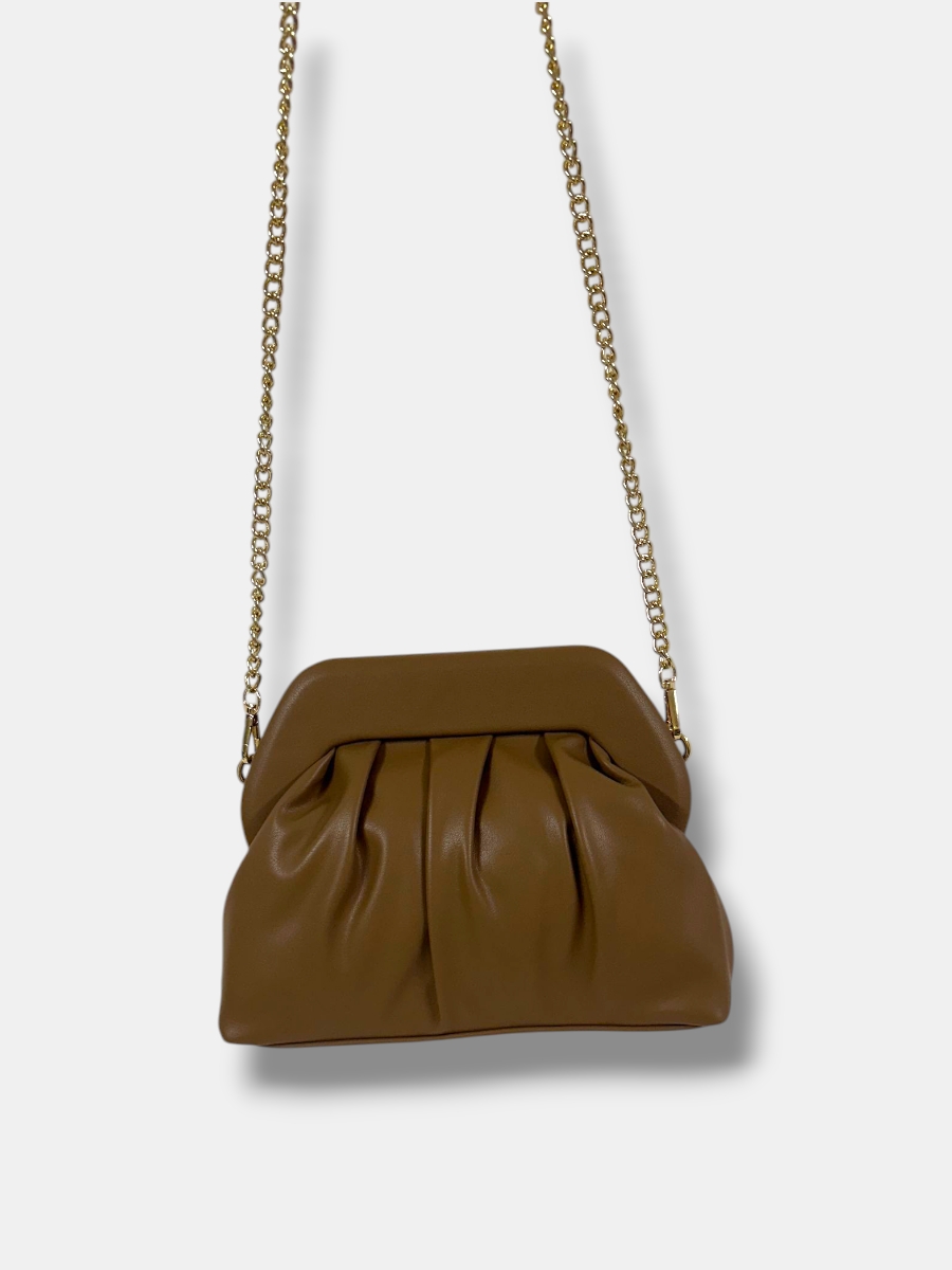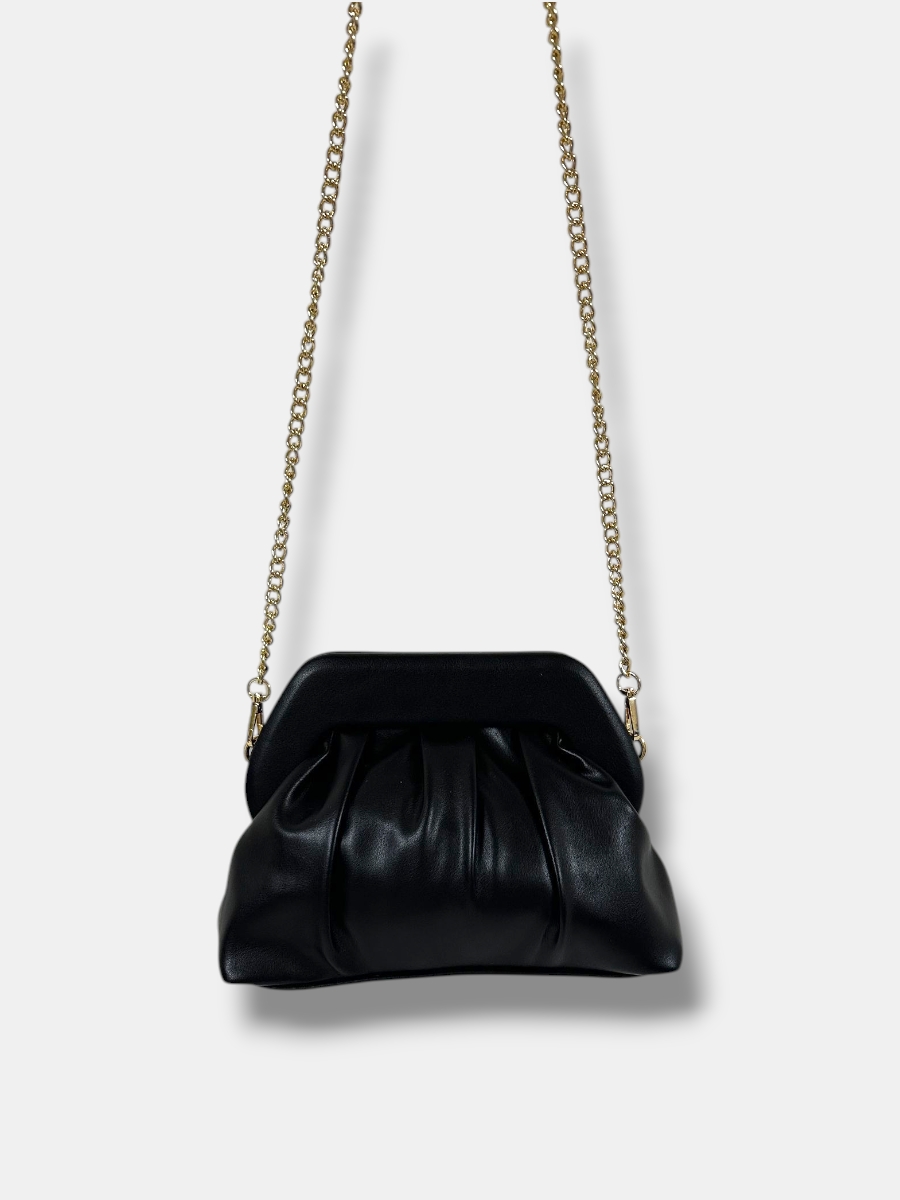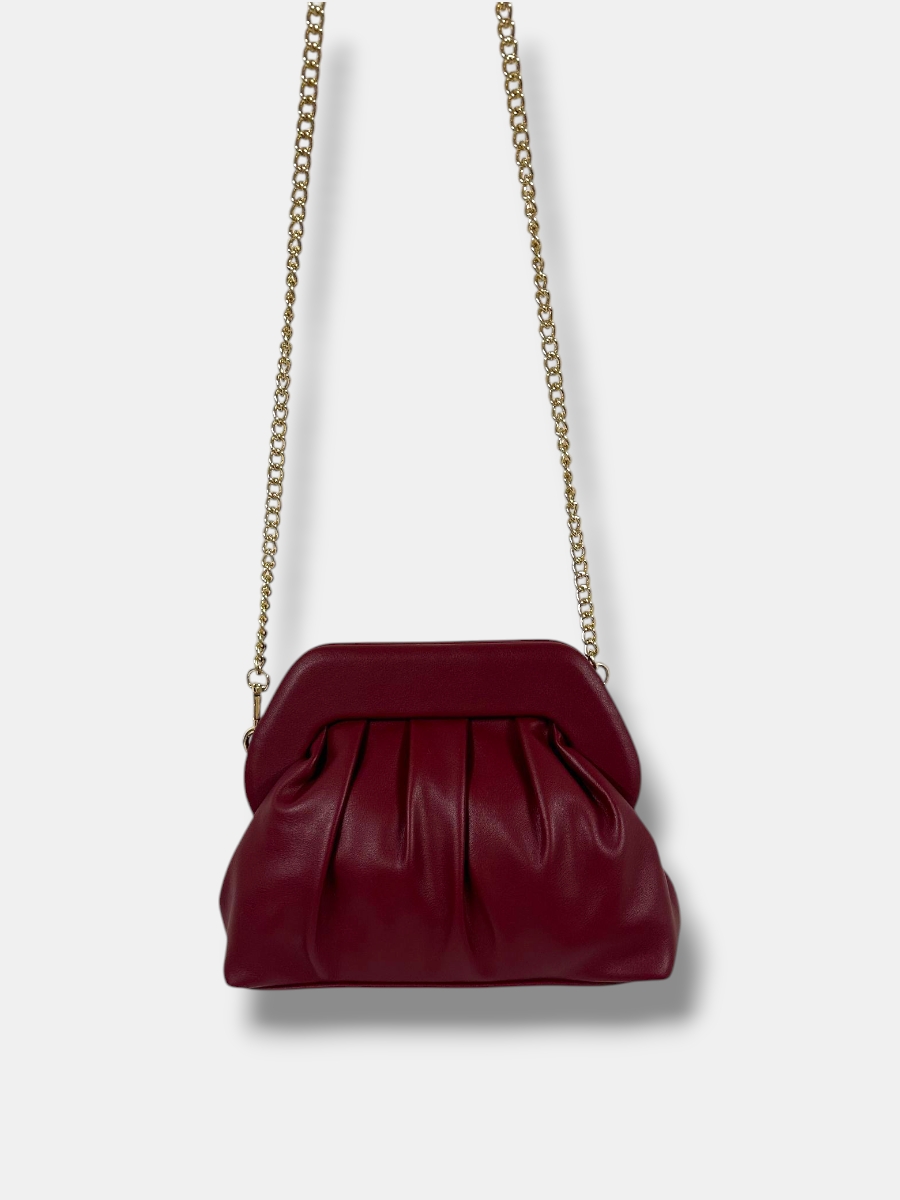 Bolso bandolera confeccionado en piel sintética, forma media luna fruncido con cierre de imán. Asa cadena fija.