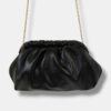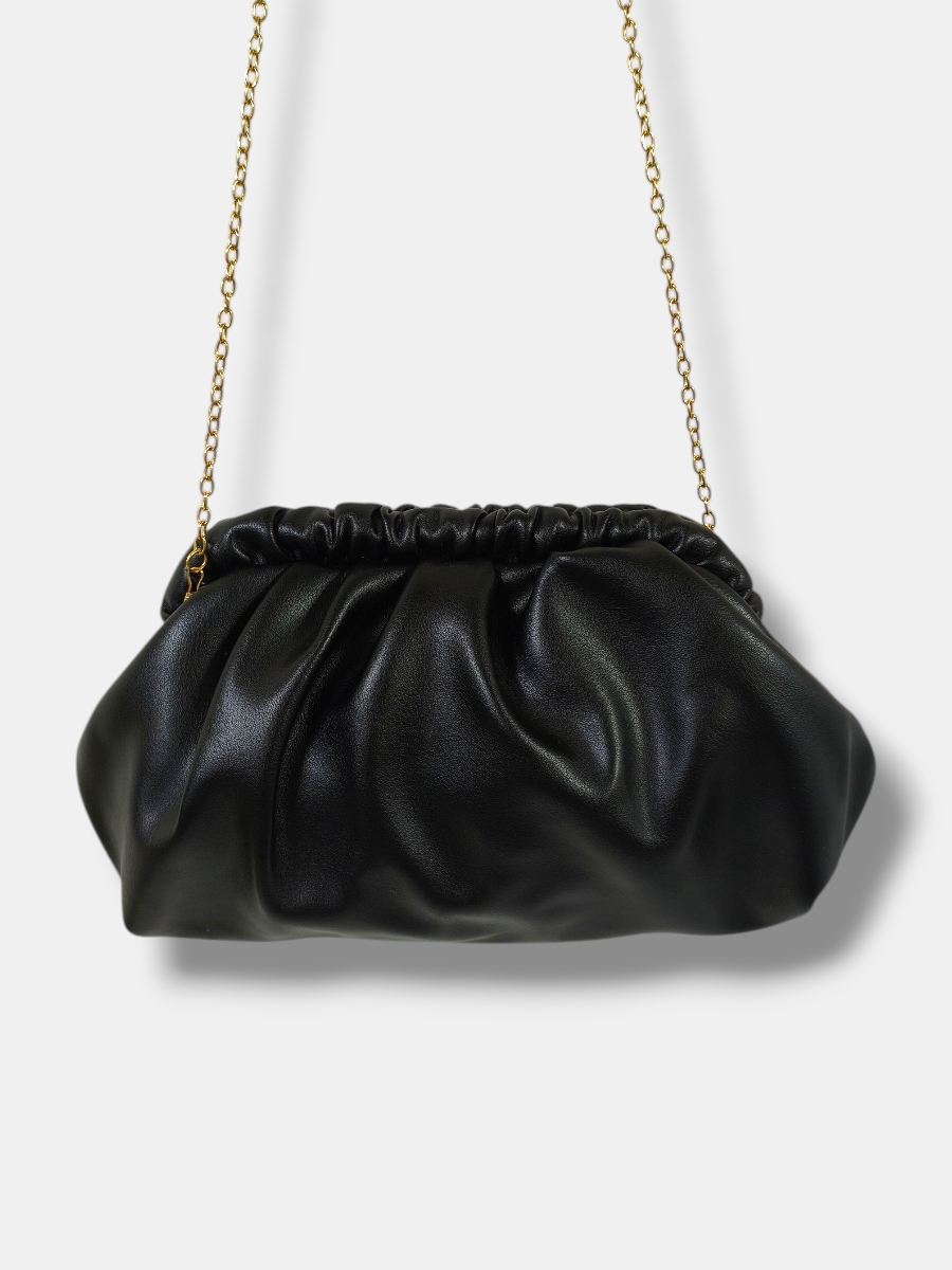 Bolso bandolera confeccionada en piel sintética cierre boca fruncido con cadena bandolera eslabones metálica.