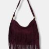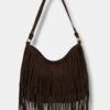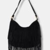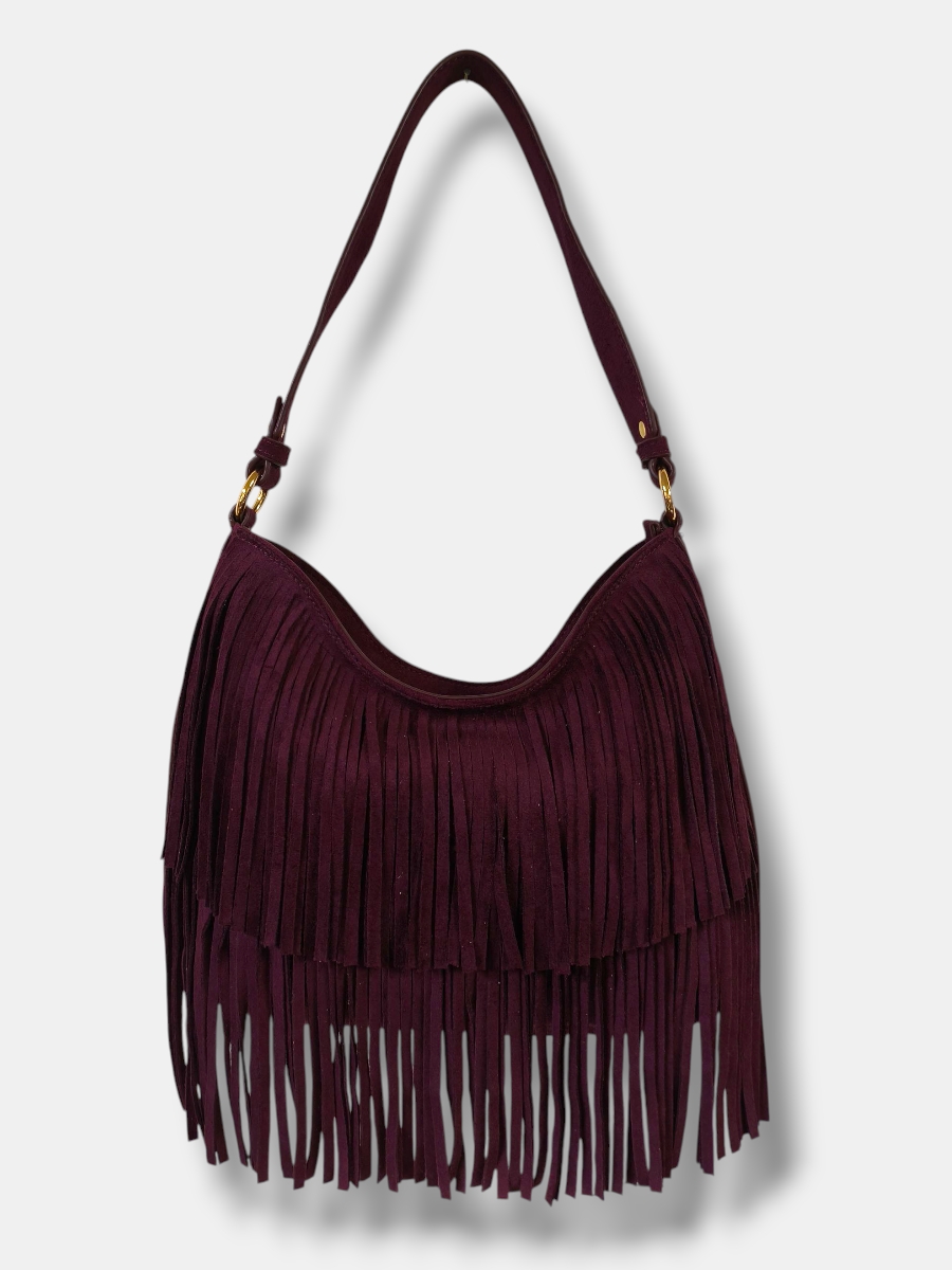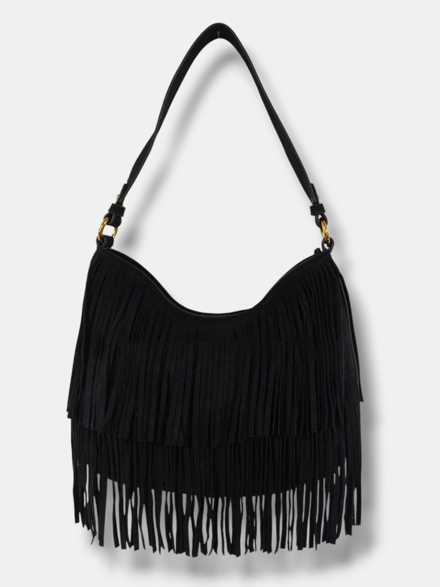 Bolso de hombro efecto piel de ante con asa fija de brazo. tres tiras flecos y cremallera metálica.