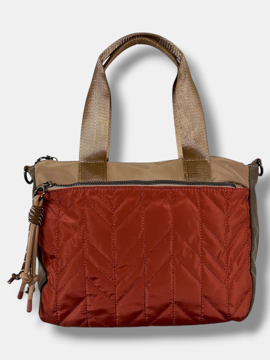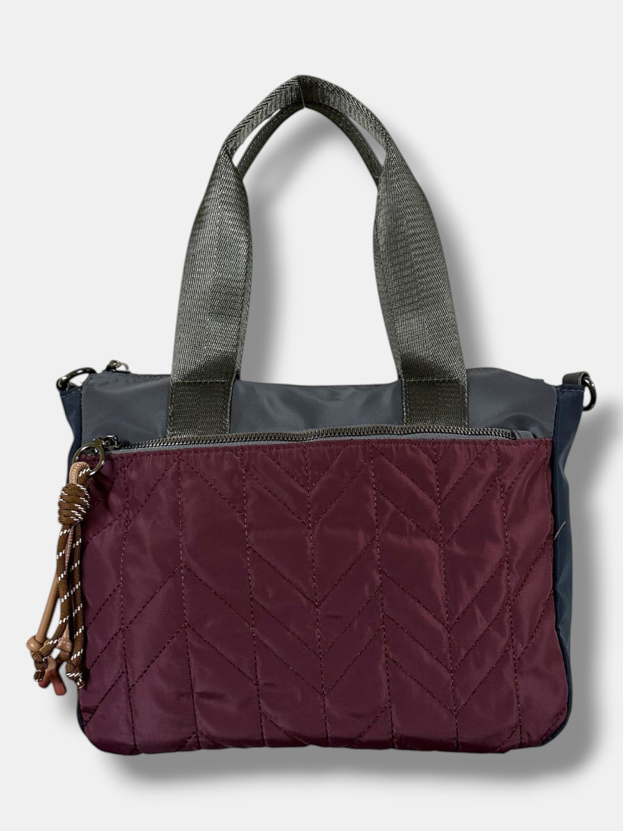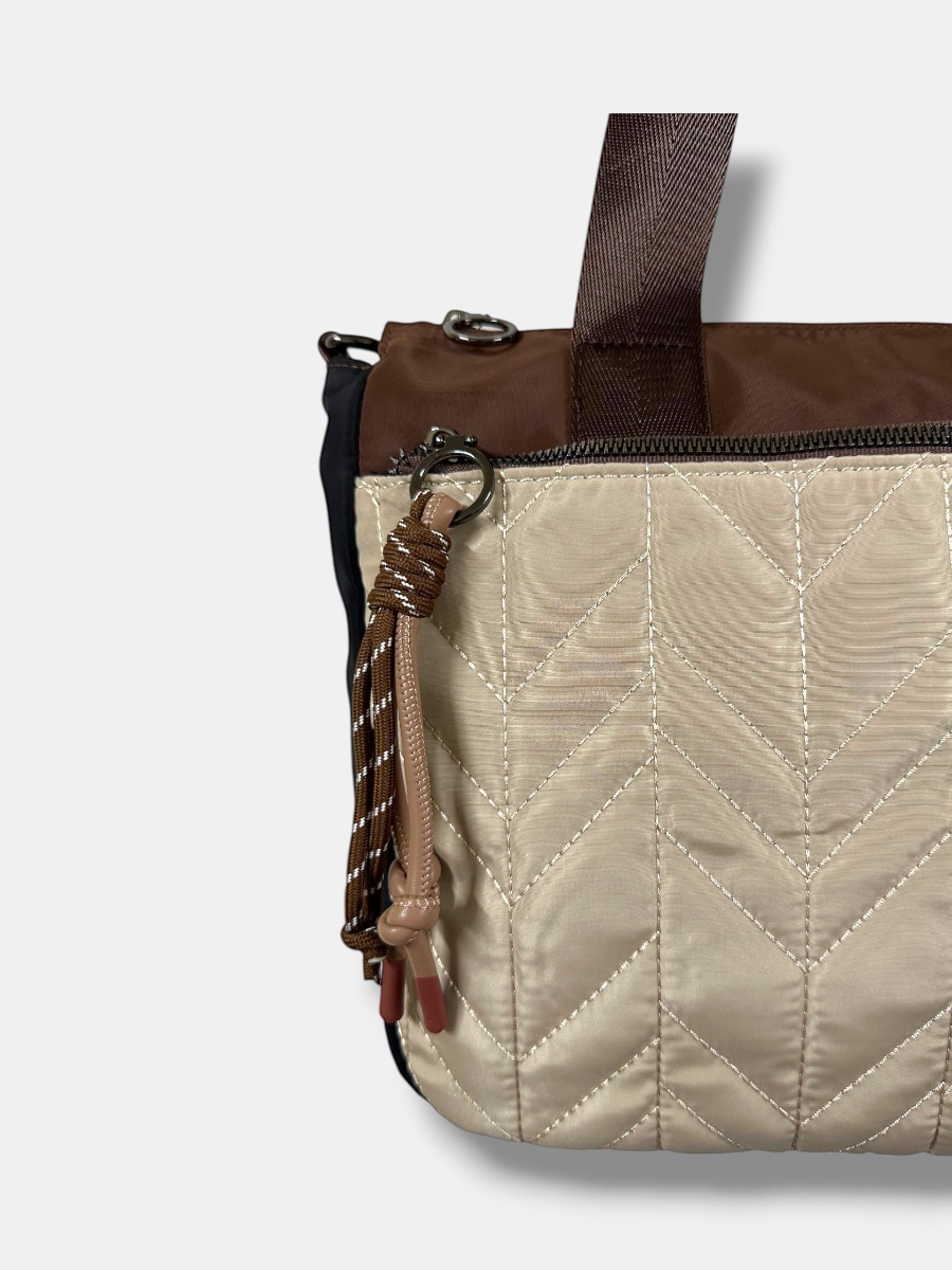 Bolso confeccionada en nylon combinada en 3 colores, bolsillo frontal con cremallera charm de cordón. Asa fija y otra regulable para bandolera.