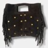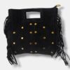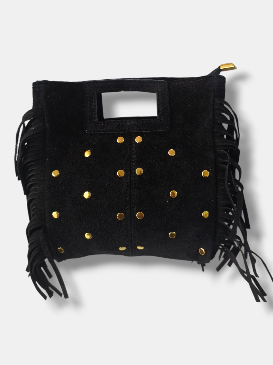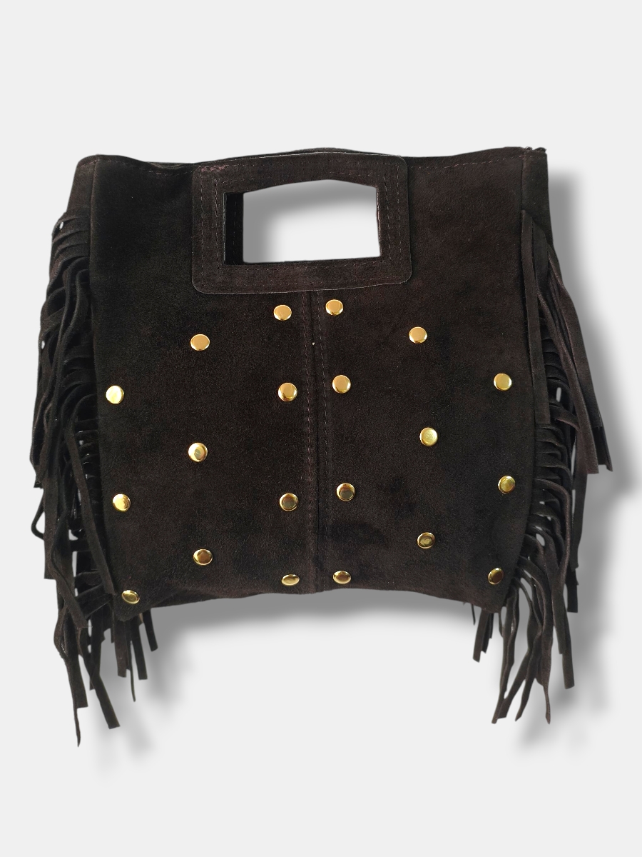 Bolso de piel ante con asa de mano y flecos laterales. Detalles en tachuelas mini doradas y asa bandolera ajustable, combinando elegancia y estilo en un diseño único.