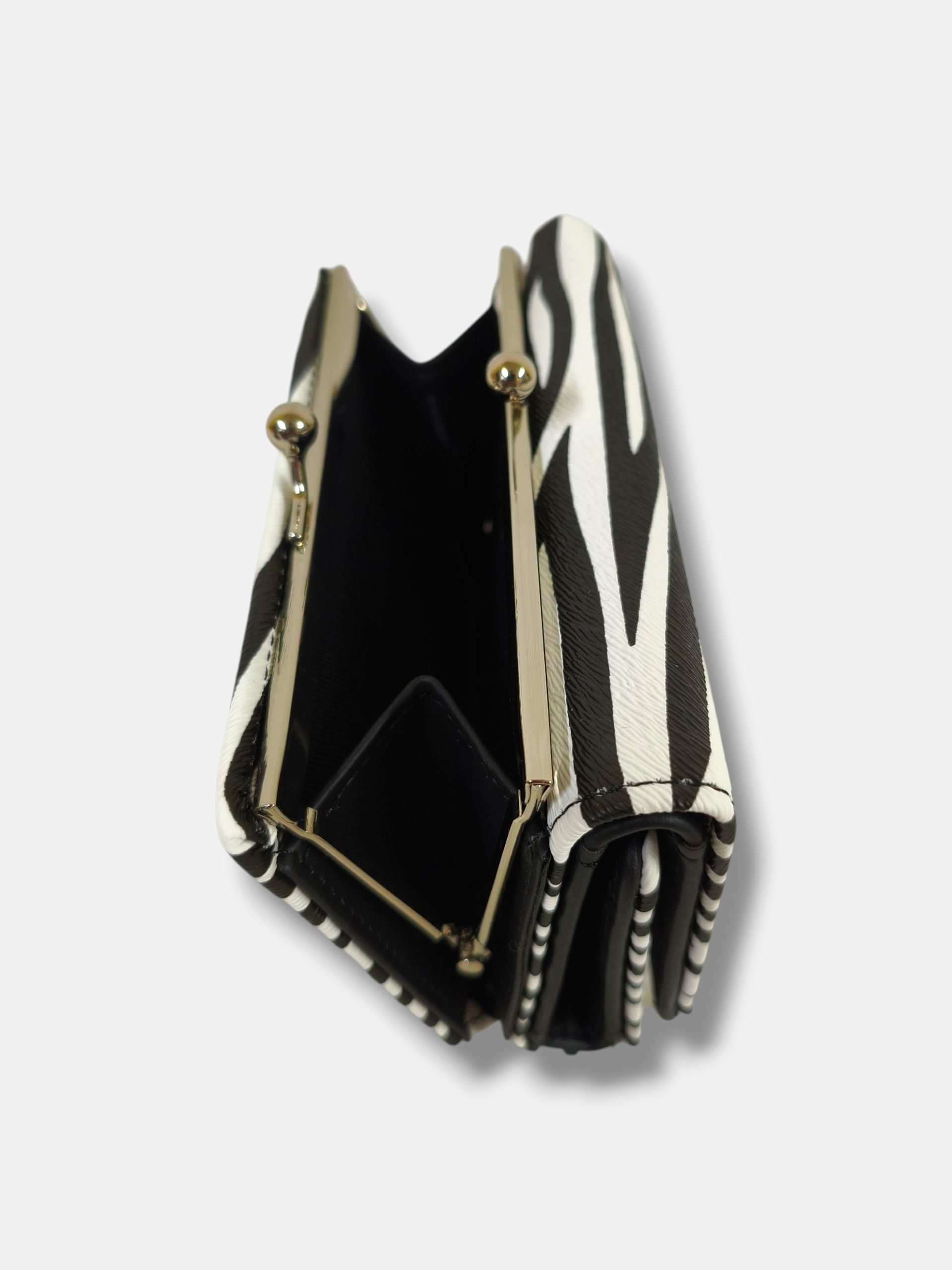 Cartera monedero confeccionada en piel sintética animal print con cierre boquilla doble bola y varios compartimentos.