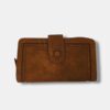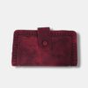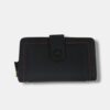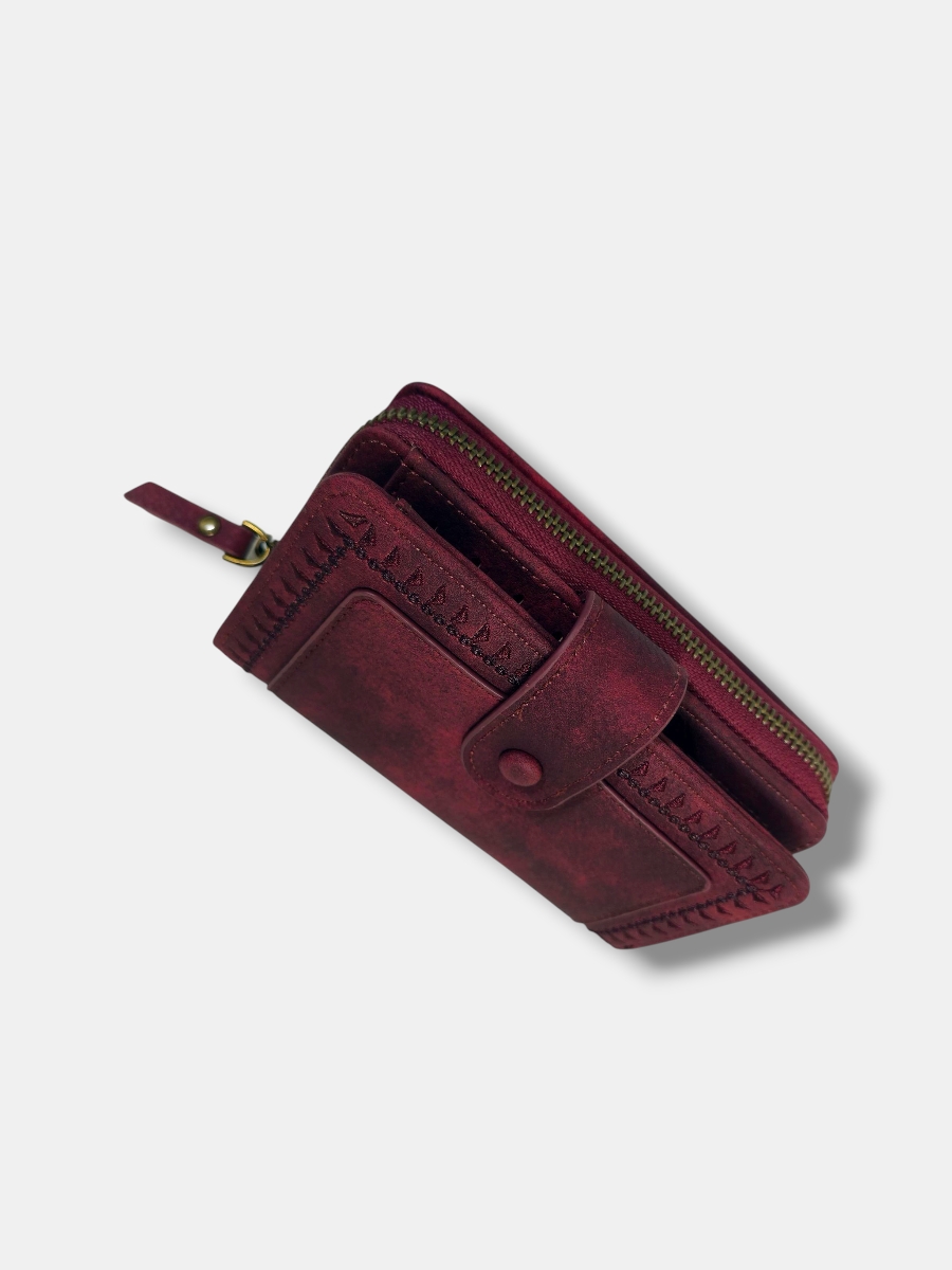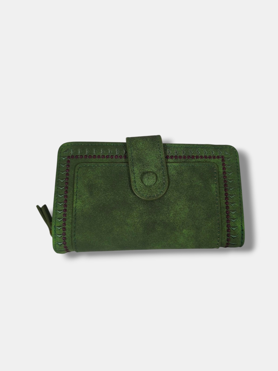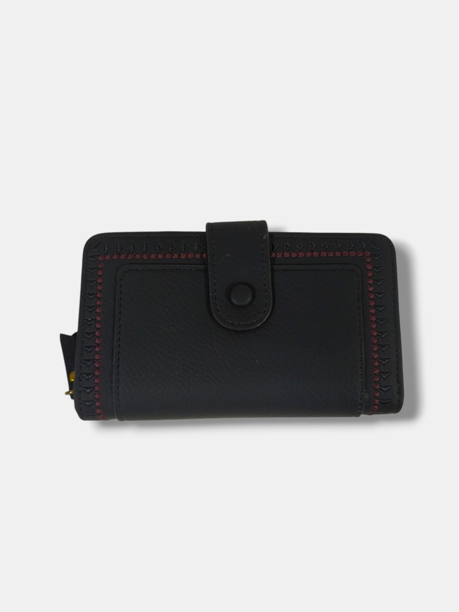 Cartera monedero en piel sintético con greca filo bordado y cierre tirilla. Varios compartimentos.