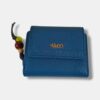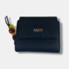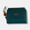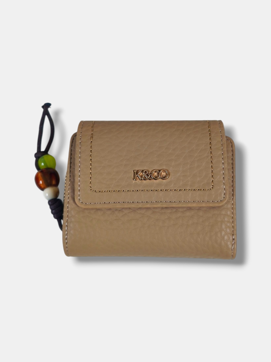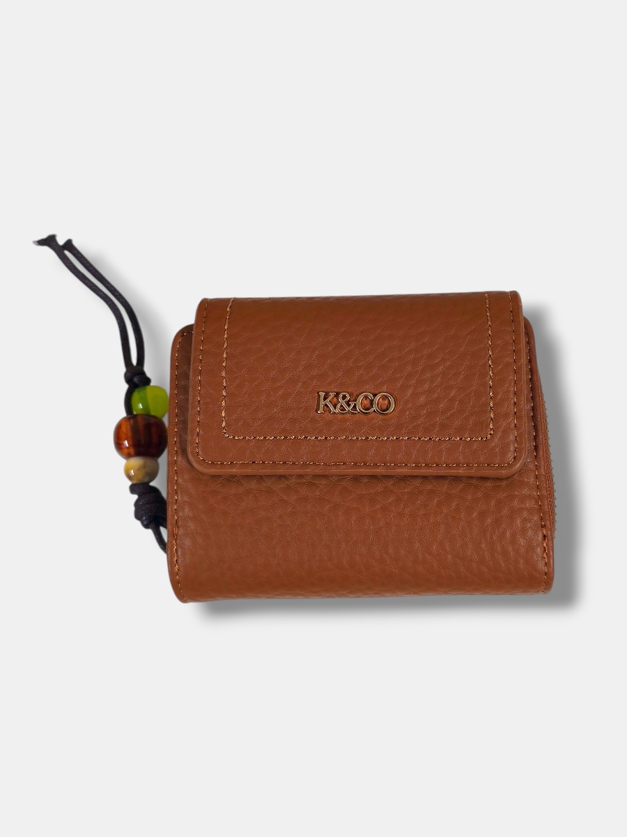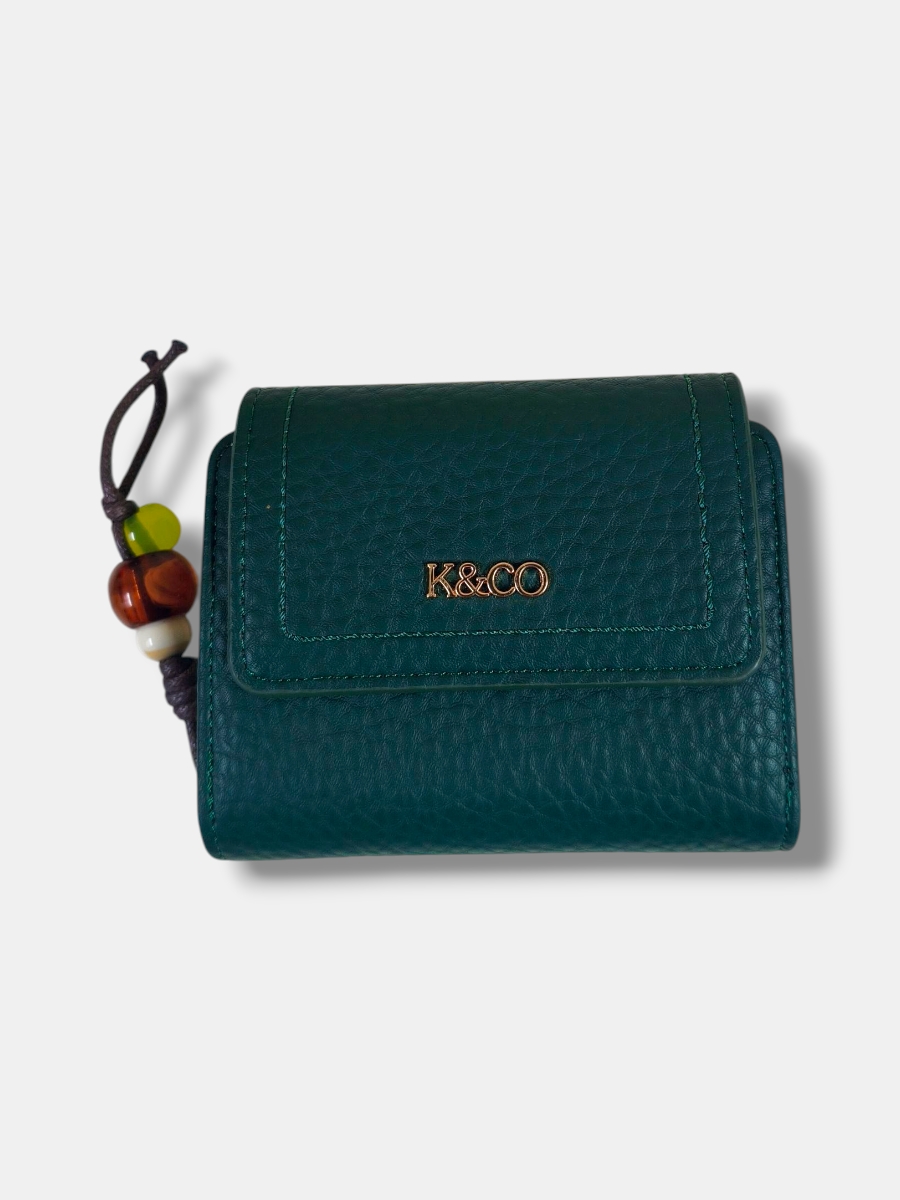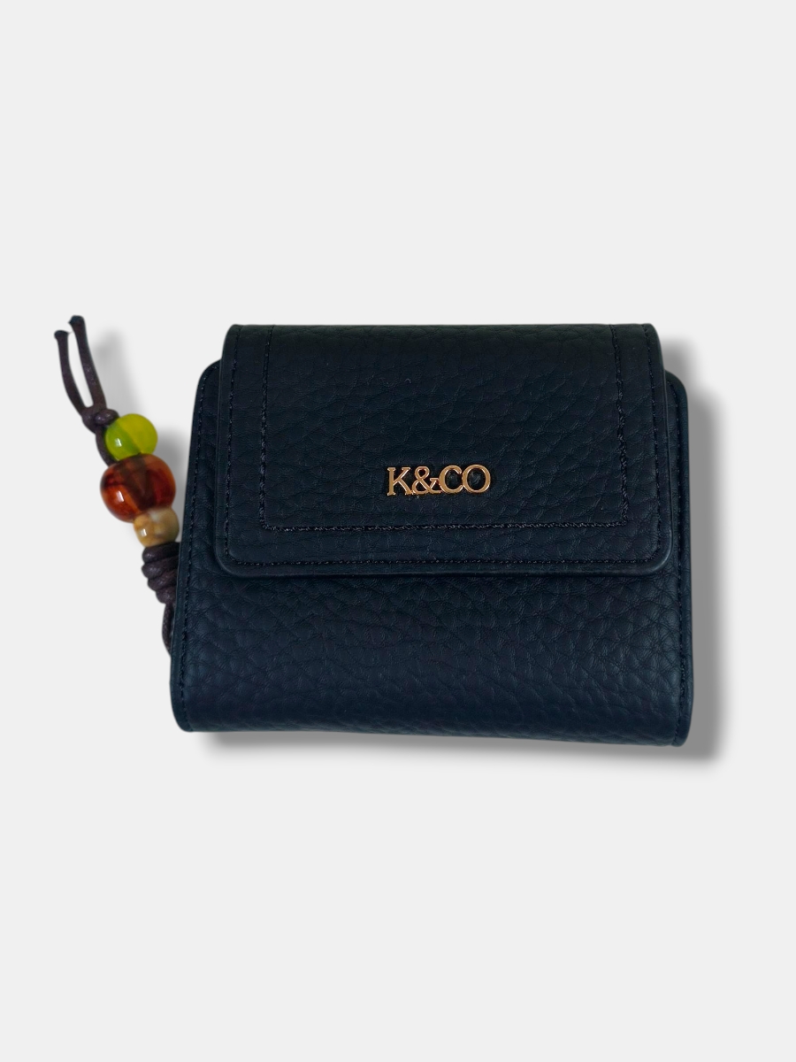 Monedero mediano en efecto piel rugosa con tapeta ancha e iniciales KYCO, elegante y sofisticado. Incluye un compartimento exterior para monedas con cierre charm de cordón y detalles en piedras, añadiendo un toque único y moderno.