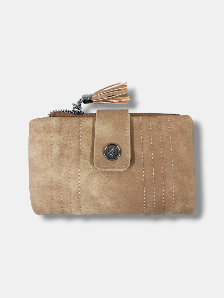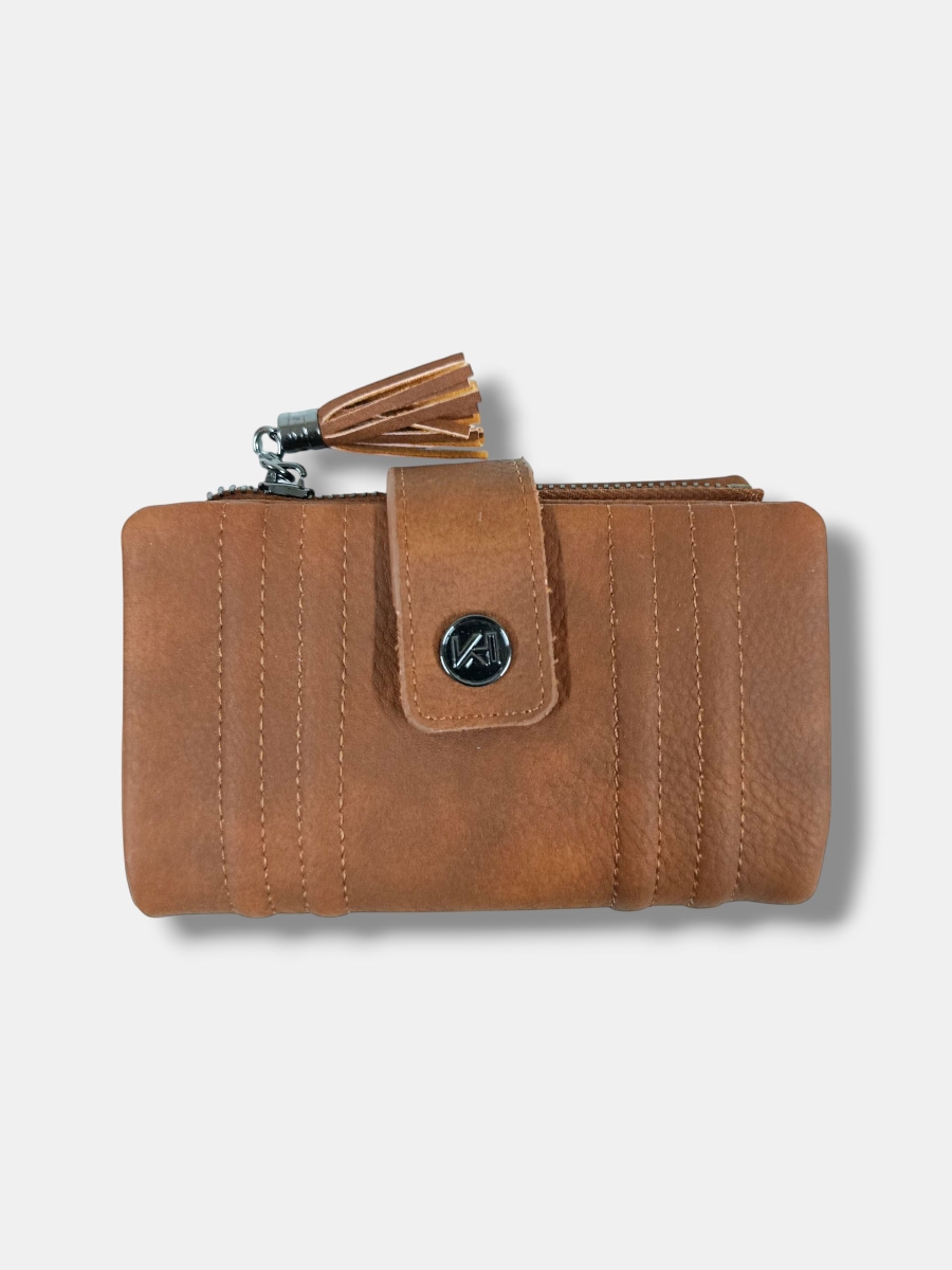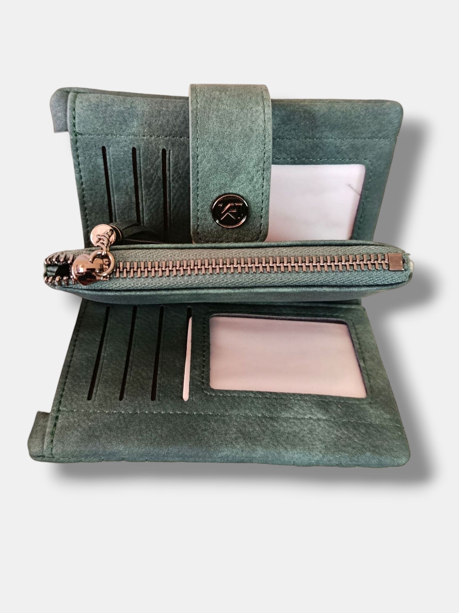 Monedero efecto piel, con colores degradados. cremallera metálica con terminación borlón y varios compartimentos.