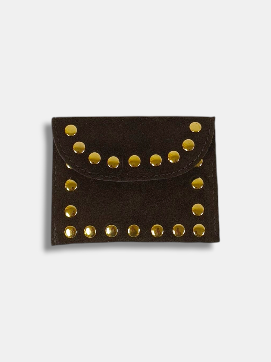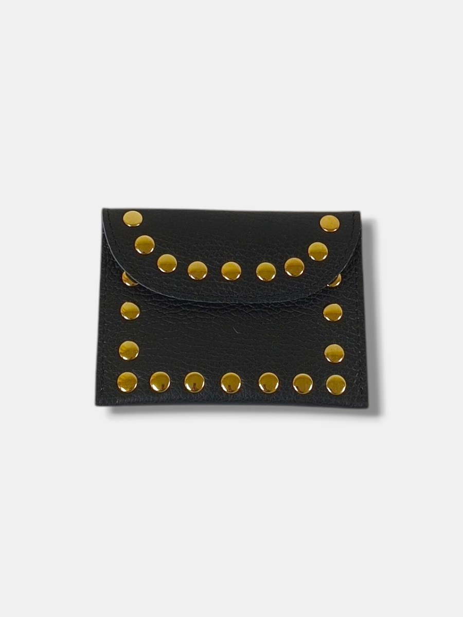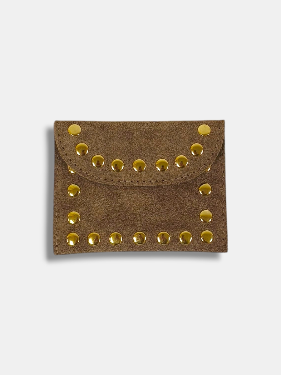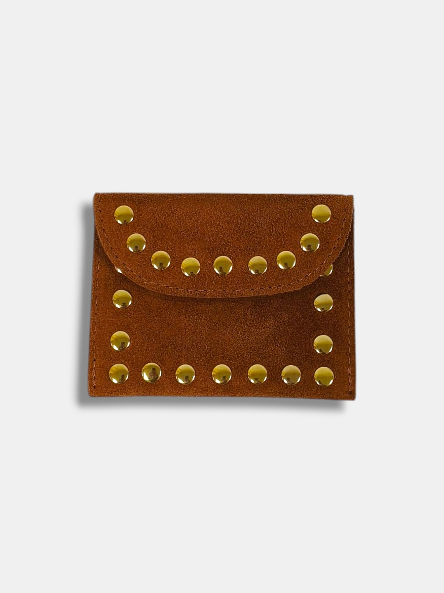 Monedero de piel ante con tapeta en forma de media luna y ribete completo con tachas. Un diseño elegante y detallado para un accesorio único y sofisticado.
