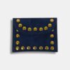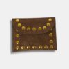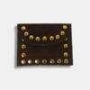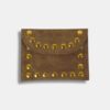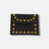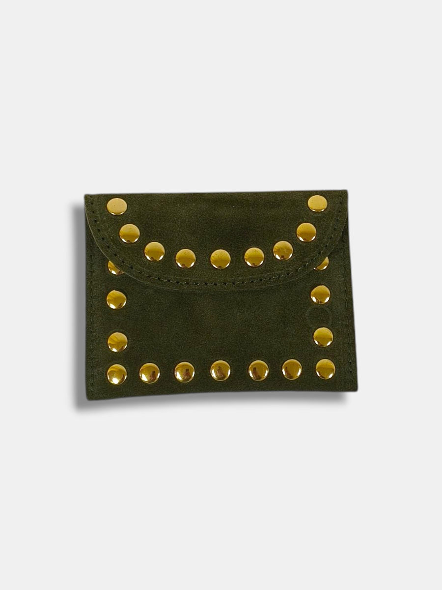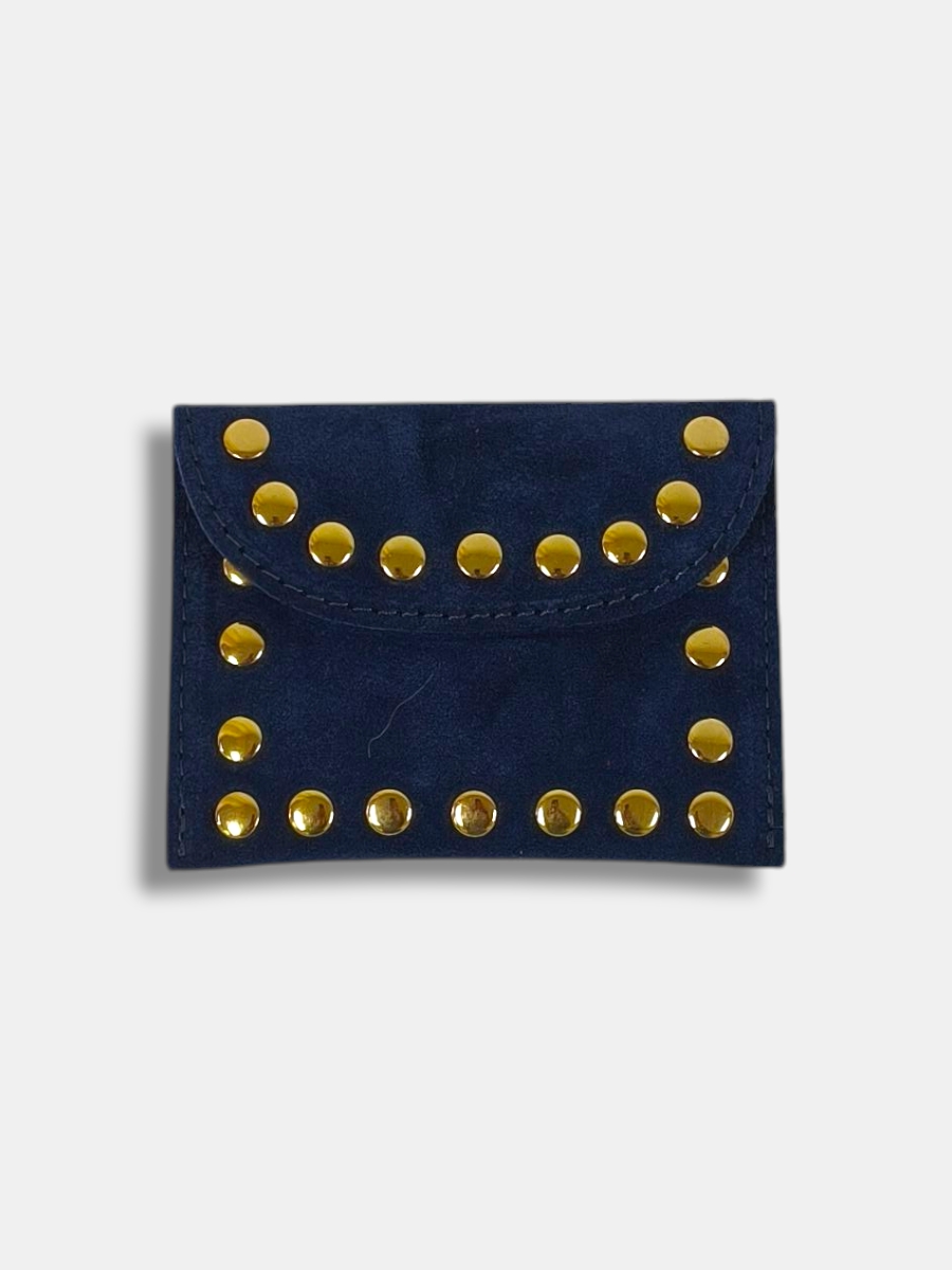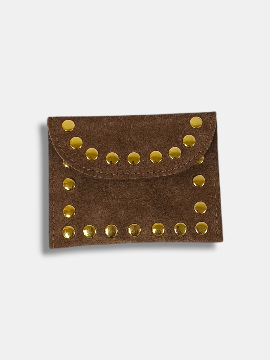 Monedero de piel ante con tapeta en forma de media luna y ribete completo con tachas. Un diseño elegante y detallado para un accesorio único y sofisticado.